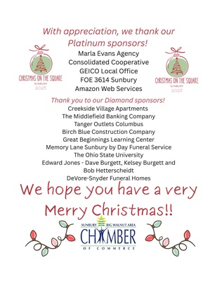 Spend time visiting our local businesses; enter the Donut-Eating contest sponsored by Table Rock Construction; experience the Lighted Parade; see Santa & Mrs. Claus and his elf; view the unique Ice Sculpting; listen to beautiful music by Sunbury Area Voices and our Big Walnut School Choirs, and of course, join us as the City of Sunbury Lights our colorful Tree on the Square!